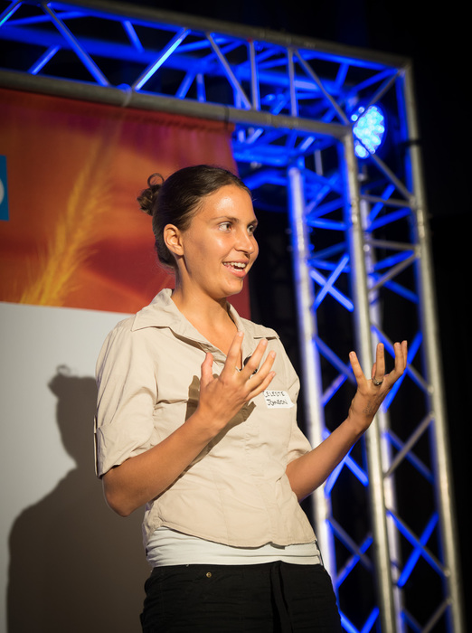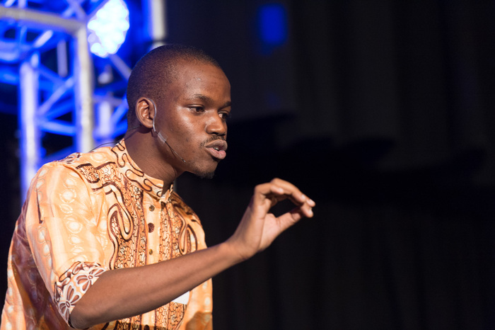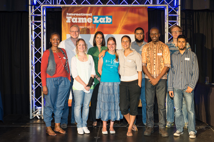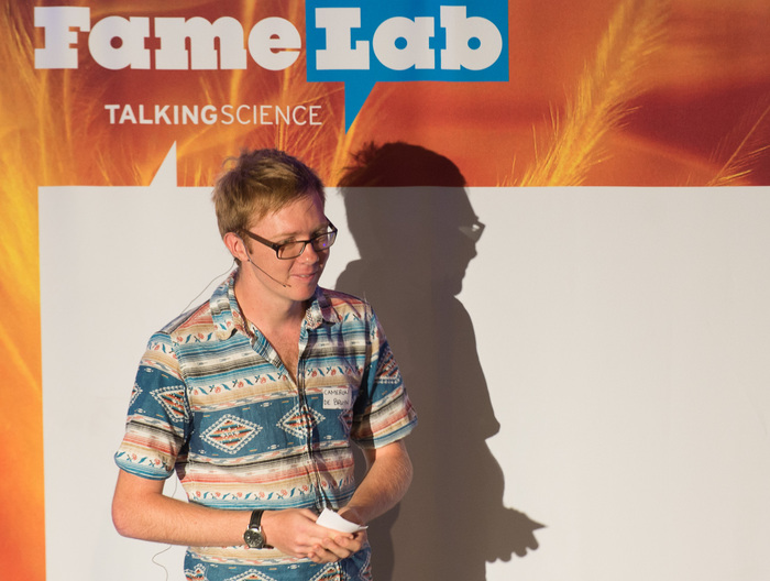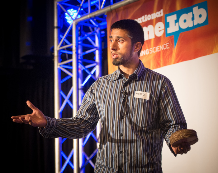 | Muhammed decided to enter FameLab the night before, courtesy of his cousin and fellow competitor, Ahmed. But now he's ready to talk about banded-iron formations and the early Earth. | |