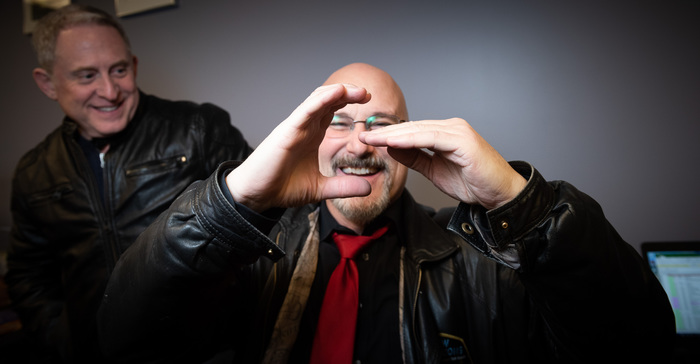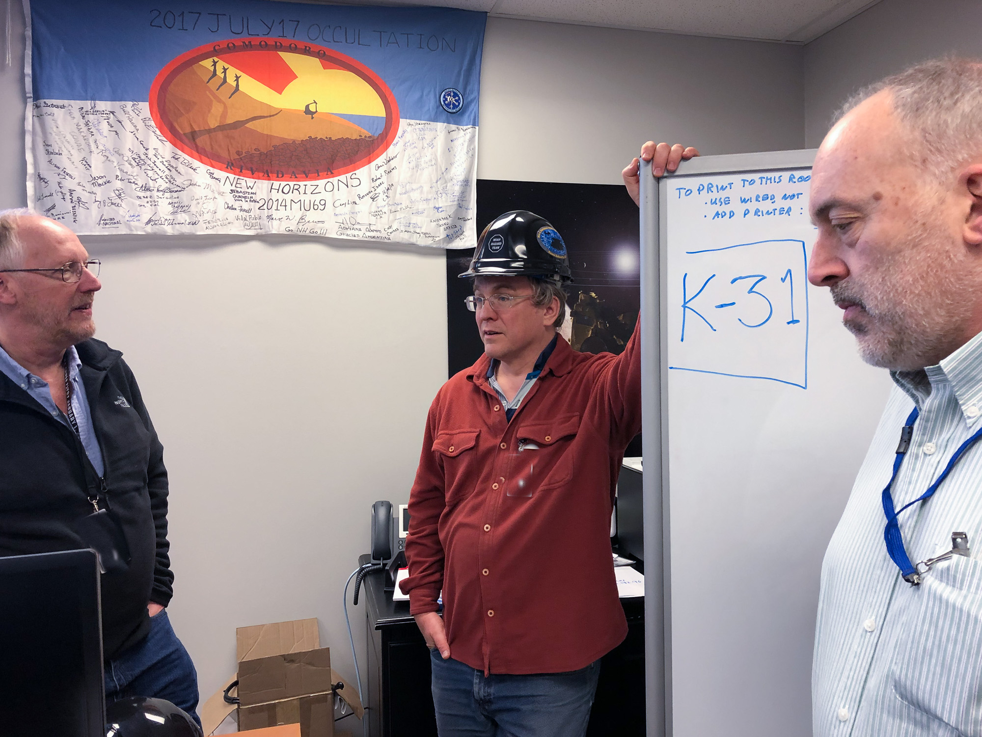 | Mark Showalter, Doug Hamilton, and David Kaufmann. Behind them is the signed flag from the summer 2017 MU69 occultation campaign to Comodoro, Argentina. We're at K-31d. |