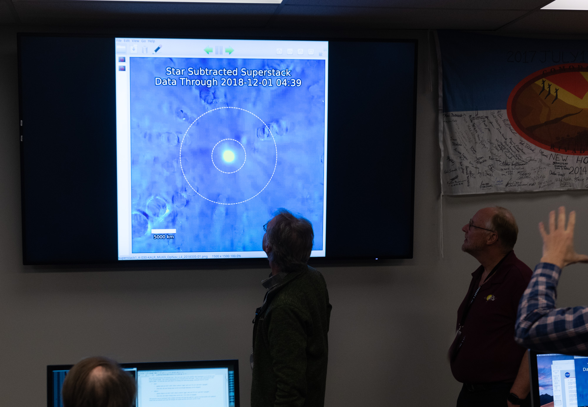 After 18 months of telecons and planning, we got to work on December 1, 2018, a month before encounter. By this point New Horizons' image of MU69 were becoming good enough that we could start to resolve structure in the system. (The images were far better at this point than what we had gotten from Hubble: HST is much larger, but further away.) We were far from seeing any detail on the body itself, but if there were very large, very bright clouds of dust thousands of km across, then even our initial surveys on December 1 would see them. And as we closed in, our scale got much better, to the point where we could resolve rings or clouds on the 100-km scale (and moons far smaller than that). These images would inform our decision over which trajectory to recommend.