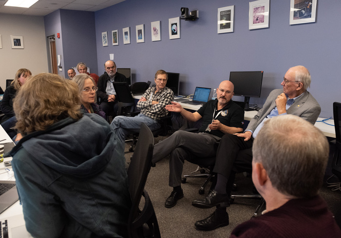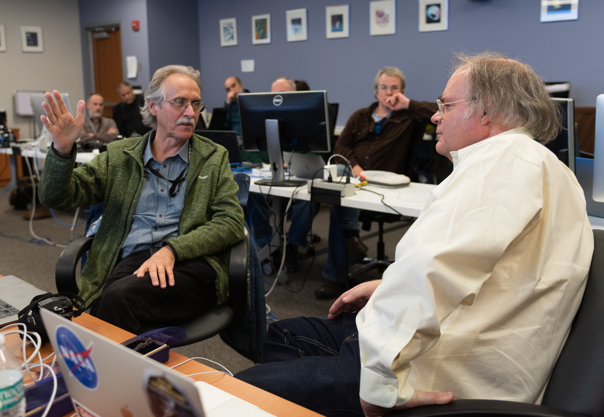 | Simon, Amanda, and Anne -- all veterans of multiple MU69 occultation campaigns -- give Marc input on fits to the light curves and occultation data. |