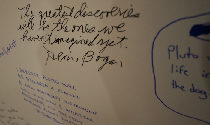 | Deputy Project Scientist Leslie Young pulls out her Pluto albedo map and gets to work on the real science here. | |