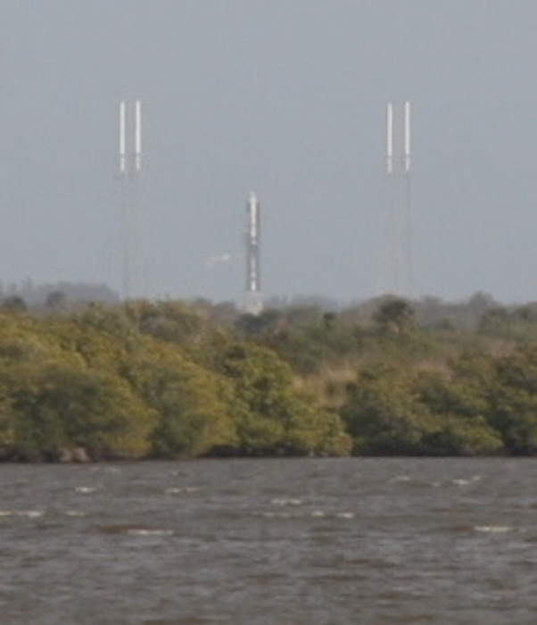 | Nominal launch is Tuesday Jan 17, 13:24 EST. Busses run between KSC and the launch viewing area at the Saturn V site, ~4 miles west of the launch pad. (Personnel running the launch are a mile or so closer, but since they're stuck inside a concrete bunker with no windows, we have a much better view.) | |