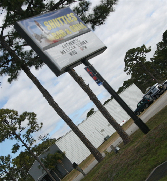 | We repose post-non-launch. Our badges get us a free round courtesy of shuttle HVAC technician Ron who sees us come in. Note the astronaut shots on the back wall. | |