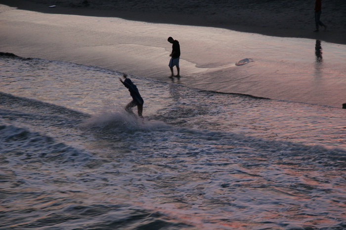 | I hang out and study surfers from the pier. (I did get in the water for some boogie boarding later on.) | |