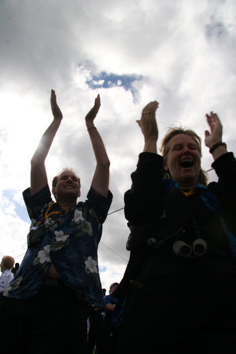 | An unanticipated problem: what to do with the kids of 1400+ people watching the launch? A game of Red Rover runs until a minor injury is had. | |