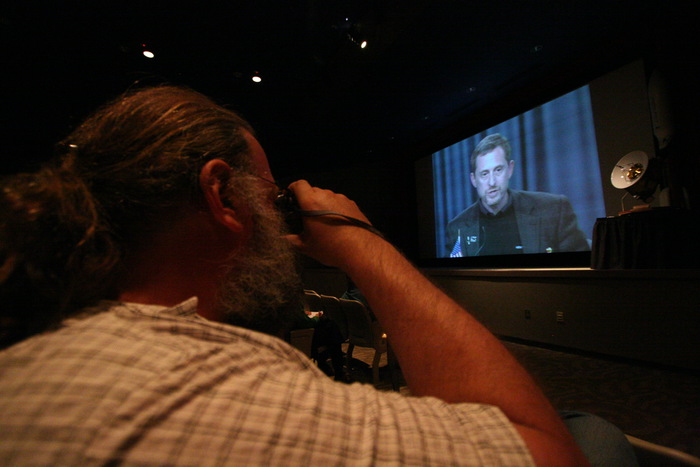 | Hal Levison poses with his kids while waiting for the post-launch press conference. | |