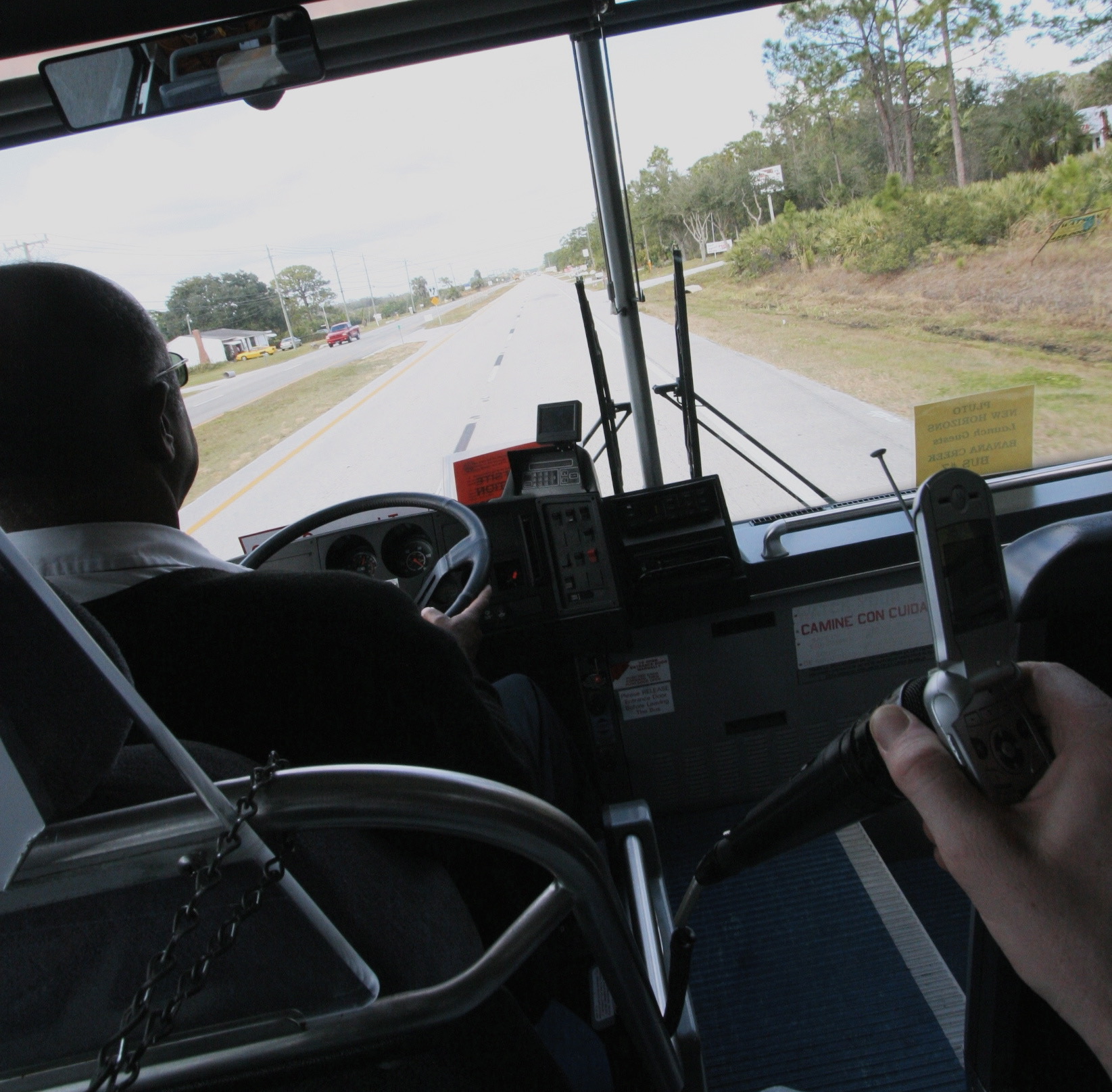 At this point my sister calls asking me about the details that she's been hearing from the NASA commentators. She's watching NASA TV in her lab in Tucson. She offers to prop her phone in front of the computer, and I talk to our bus driver Earl and ask if I can commandeer the PA system. I hook in my cell phone to the mic, we turn off the infomercials, and we drive back to Kennedy while cheering after each event (those we can understand, at least -- this signal is being transmitted from launch control Florida -> NASA TV in Houston -> satellite -> ISP -> streaming video -> Internet -> Heather's lab in Tucson -> phone network -> cell phone towers -> bus back in Florida). We pull up just as the spacecraft has separated and is set on its way, coasting to Pluto.