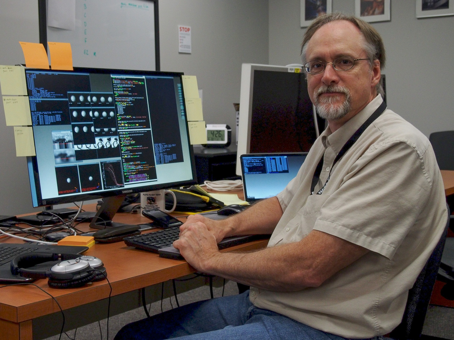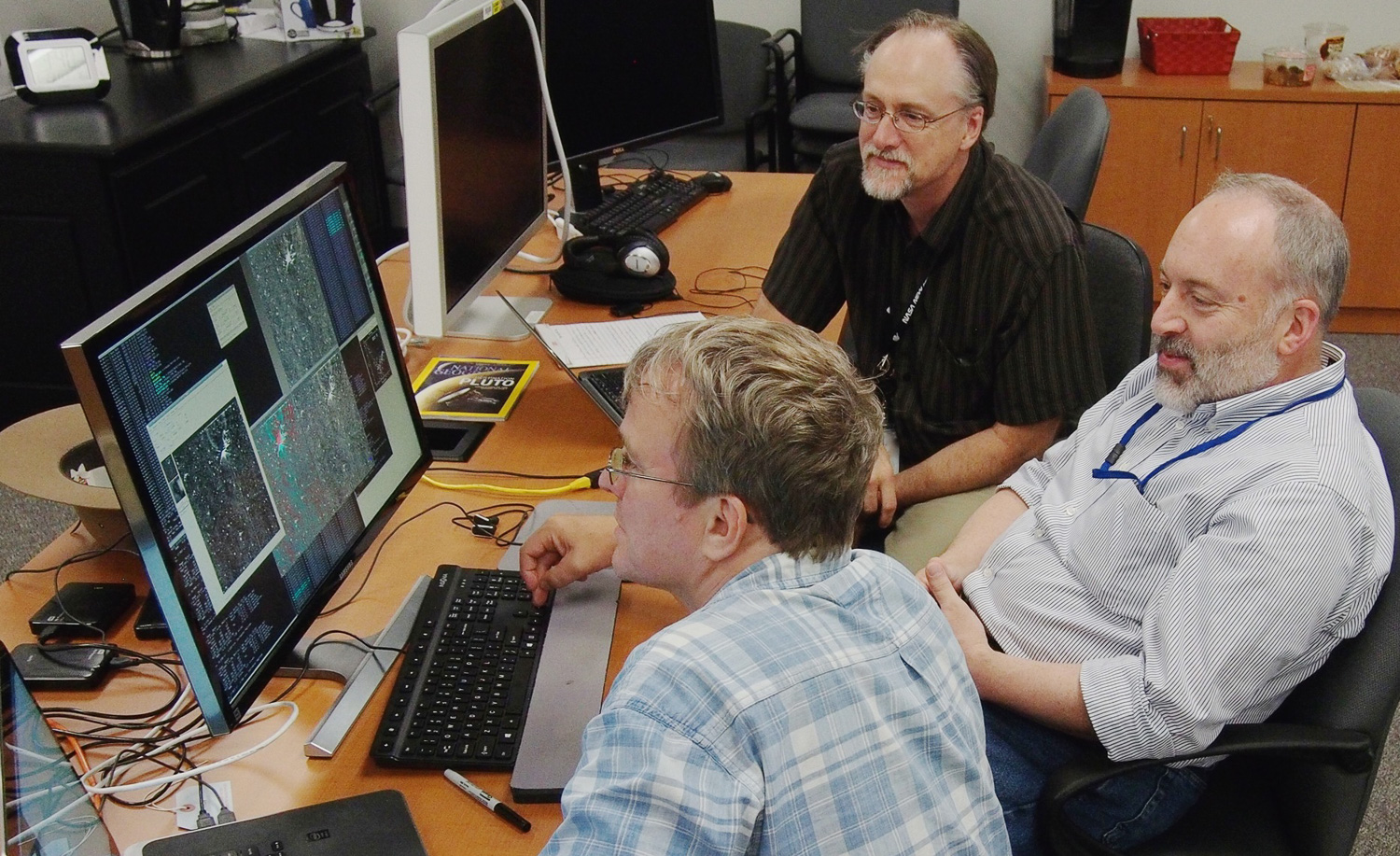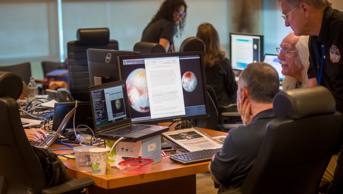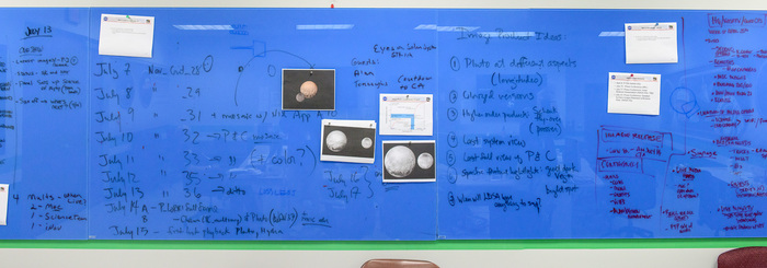 | Dennis Reuter, Will Grundy, and Dale Cruikshank wordsmith over a press release on that color MVIC map. The draft reads "Pluto, Charon Shine in Exaggerated Color", which was changed to "false color" by the time it made it into the (real release) on the day of the flyby. "But the colors aren't false -- they're at the right wavelengths, just exaggerated!" |