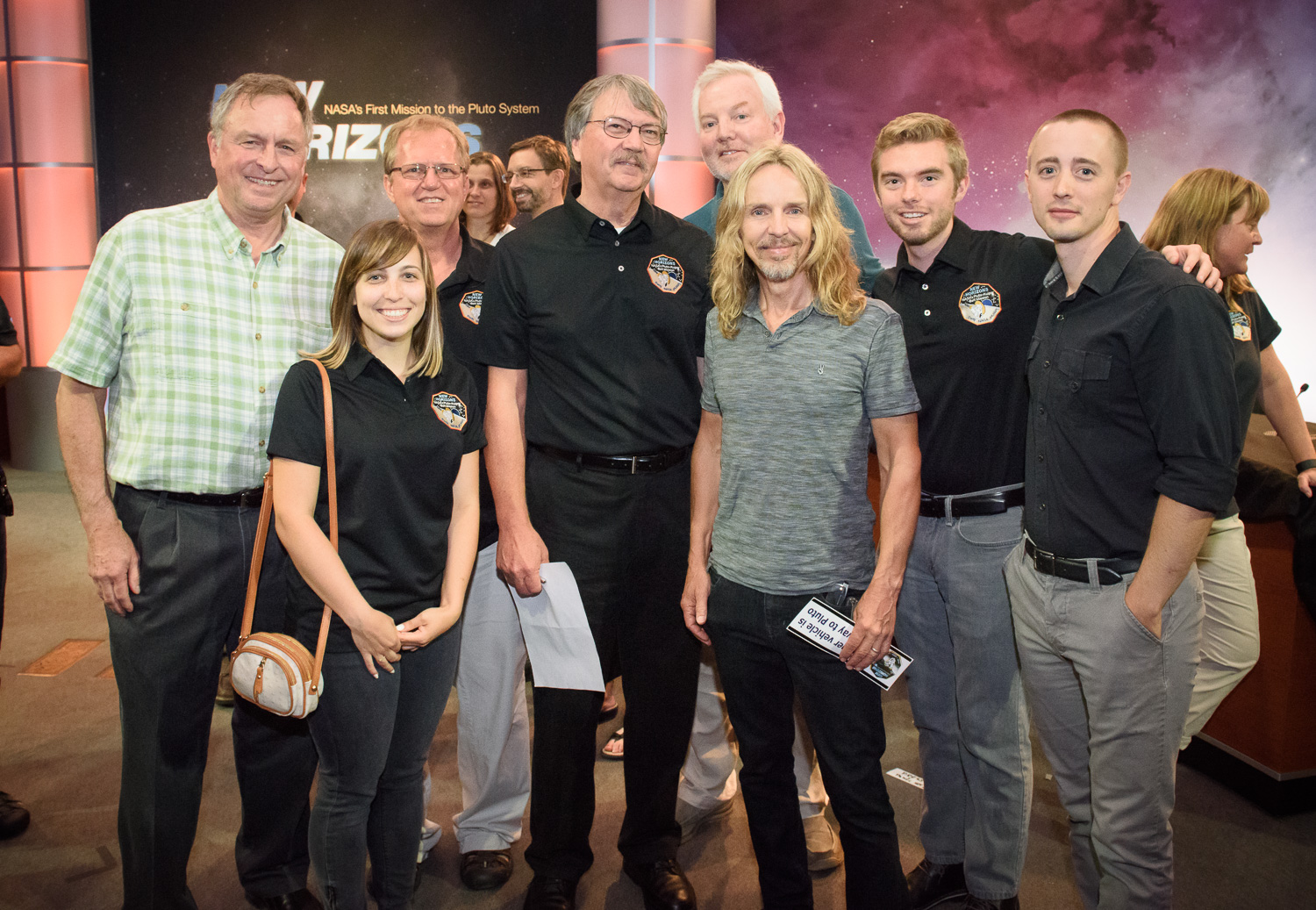 | Alice Bowman adores Brian! With mission ops crew: __, Ann Harch, Helen Hart, __, Brian May, Alice Bowman, Jon Vandergriff, Hong ___. |