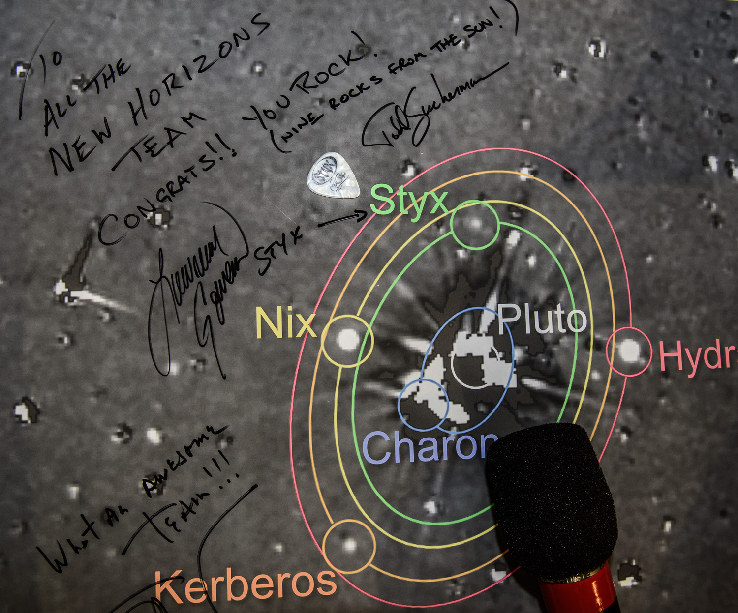 | Tommy Shaw signs a portrait of the Pluto system, used for the recently concluded hazard search. |