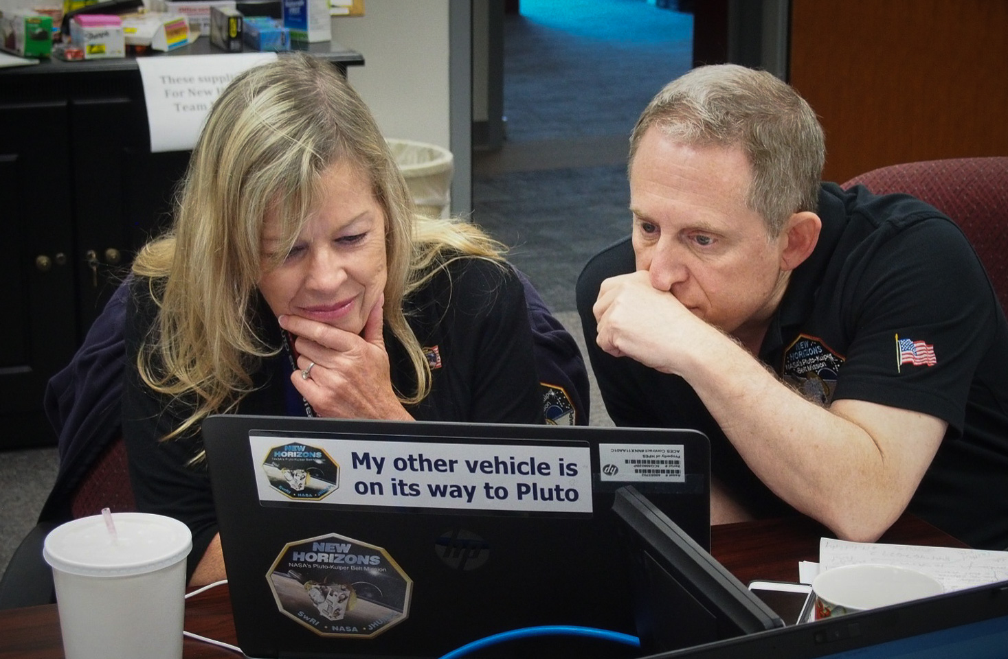 | Laurie Cantillo and Alan Stern strategize on media materials. |