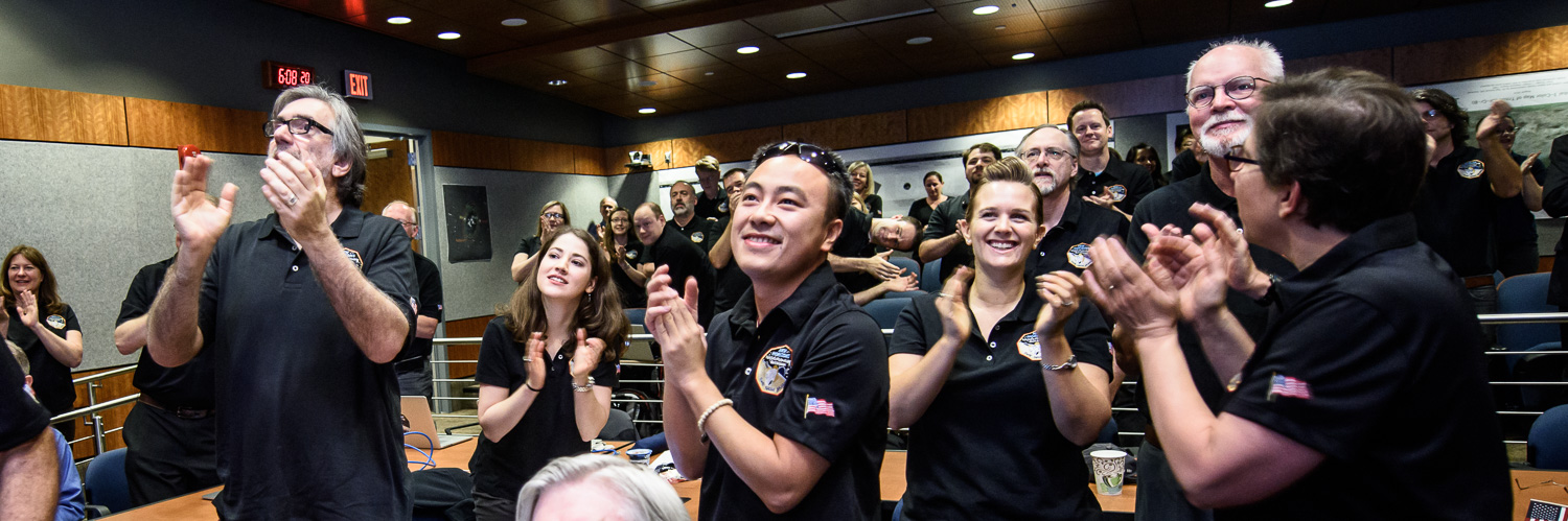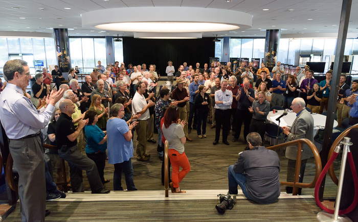 | Mission controllers and engineers from Mission Ops file into the Kosiakoff Center to much applause. |
