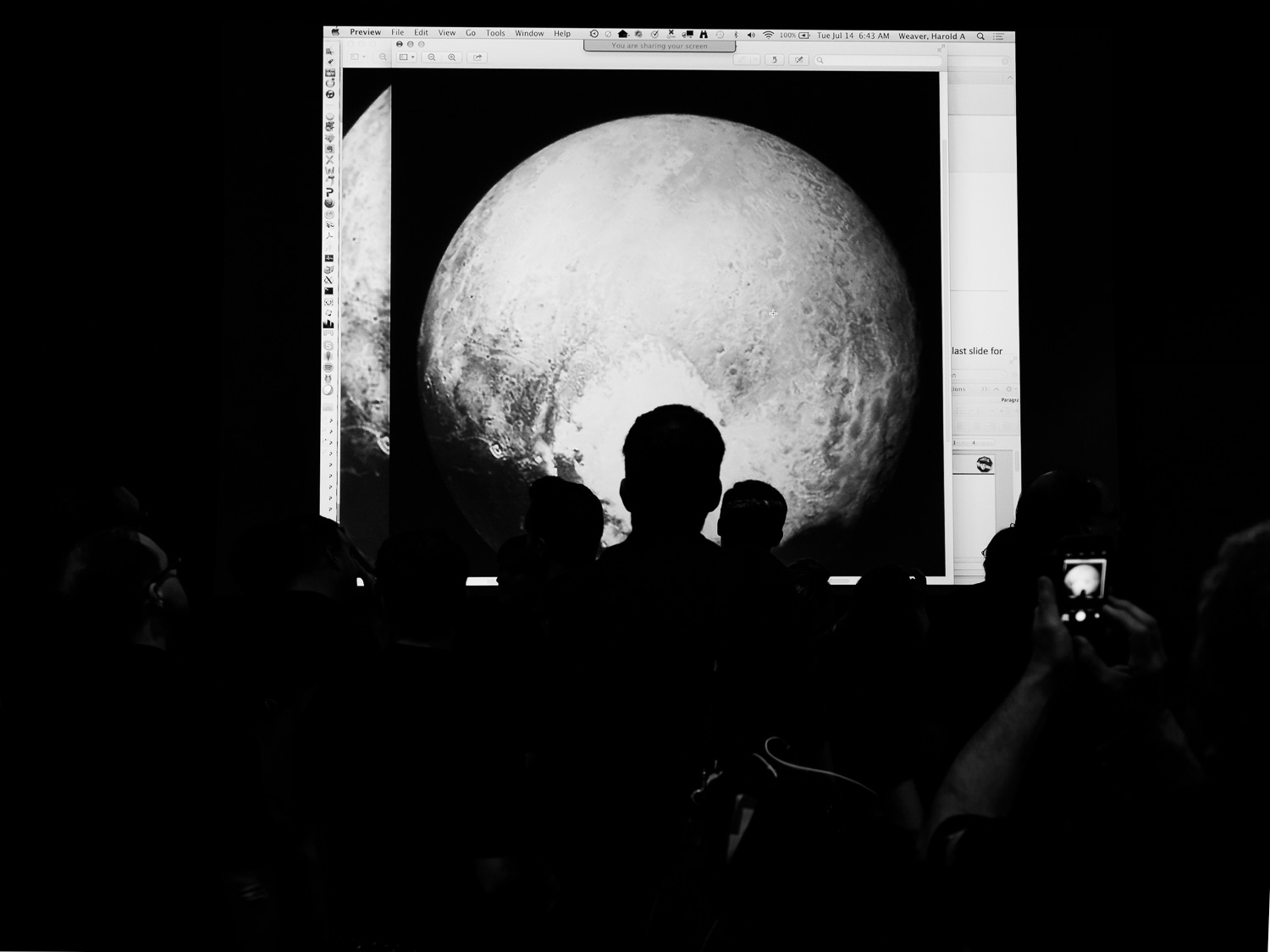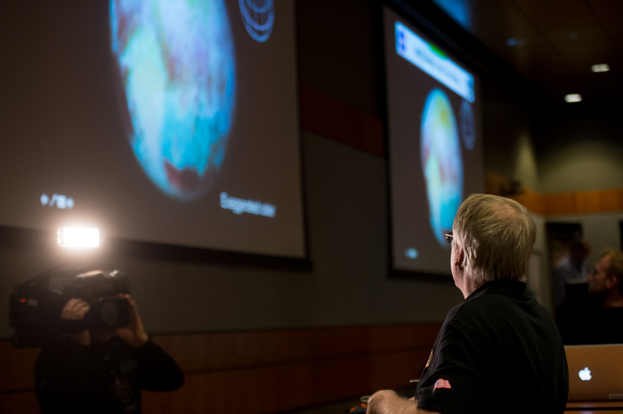 | About to show the first close-up pictures of Pluto and Charon! Dwayne Brown, Alan Stern, Will Grundy, Cathy Olkin, and John Spencer at the P+1d press conference at the APL Kosiakoff Center. If you're going to watch just one movie about Pluto, this is the one to watch. Everything we thought we knew about Pluto has changed in the last 24 hours. All of our models are wrong, and that's why they're all smiling. |