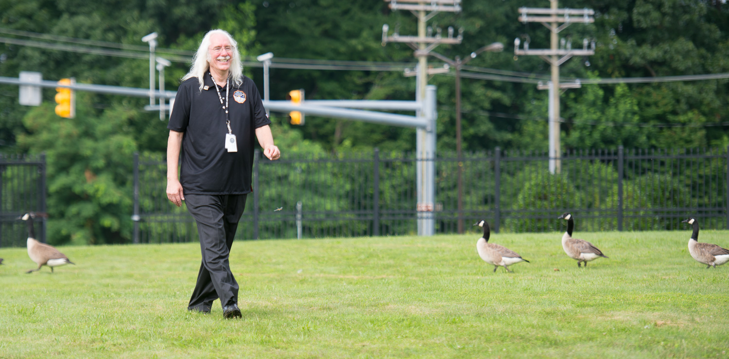 | Dennis Reuter walks past APL's geese. Black and white never goes out of style! |
