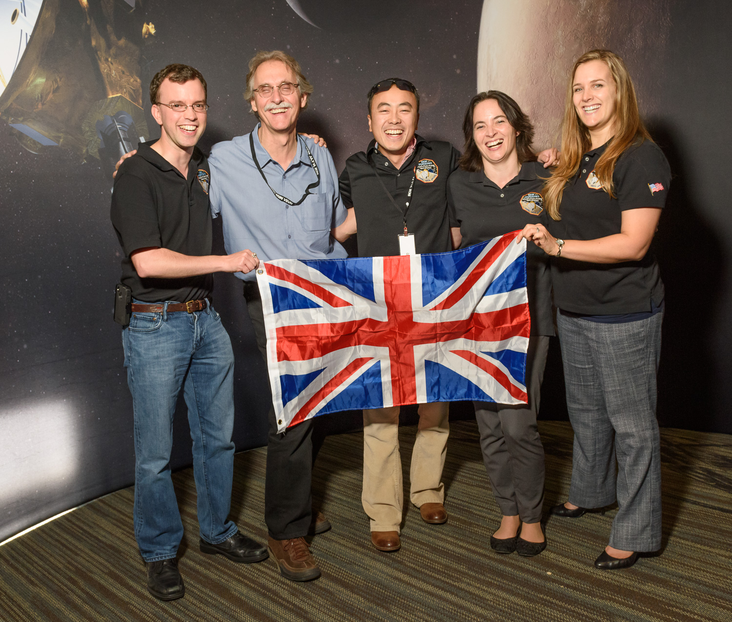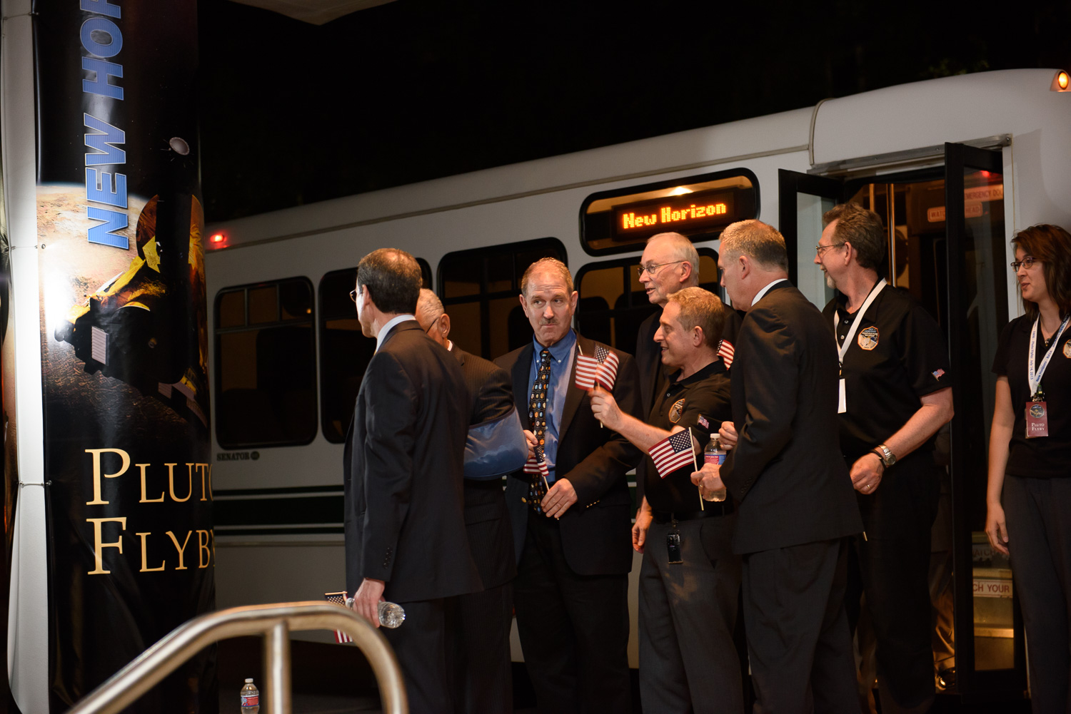 | John Grunsfeld, Alan Stern, Alice Bowman, and Glen Fountain wave those flags at the Kosiakoff Center, post-flyby. |