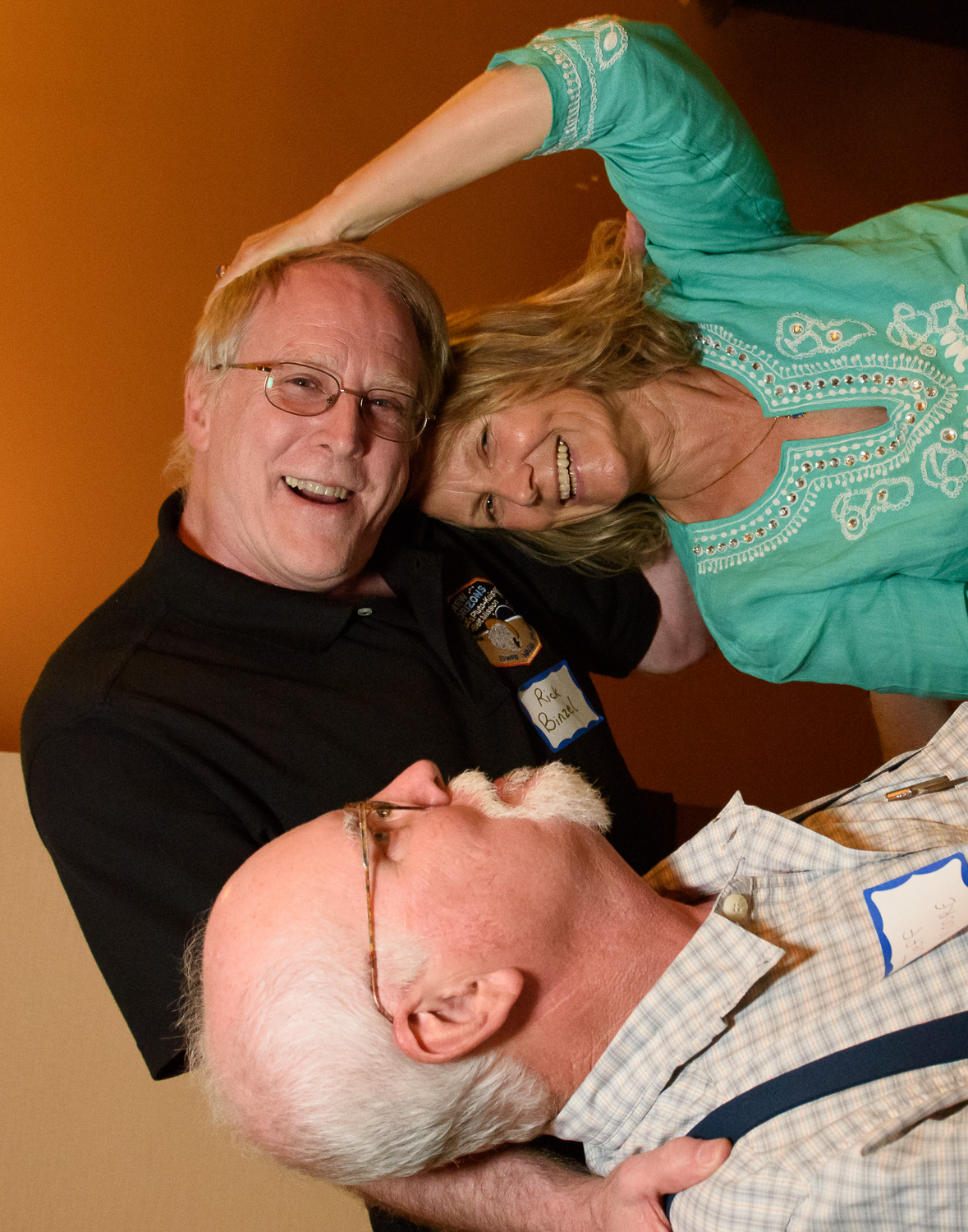 | It's Jim Christy (discoverer of Charon) and Charlene Christy (namesake of the moon)! I talked with Jim for quite awhile. And Charlene and I go back a long time: at the Pluto launch in 2006, Leslie Young took the opportunity to decorate my head like a surface map of Pluto, using the best-available data at the time. In one of the highlight of my scientific career, I talked Charlene into orbiting me. here and here. |