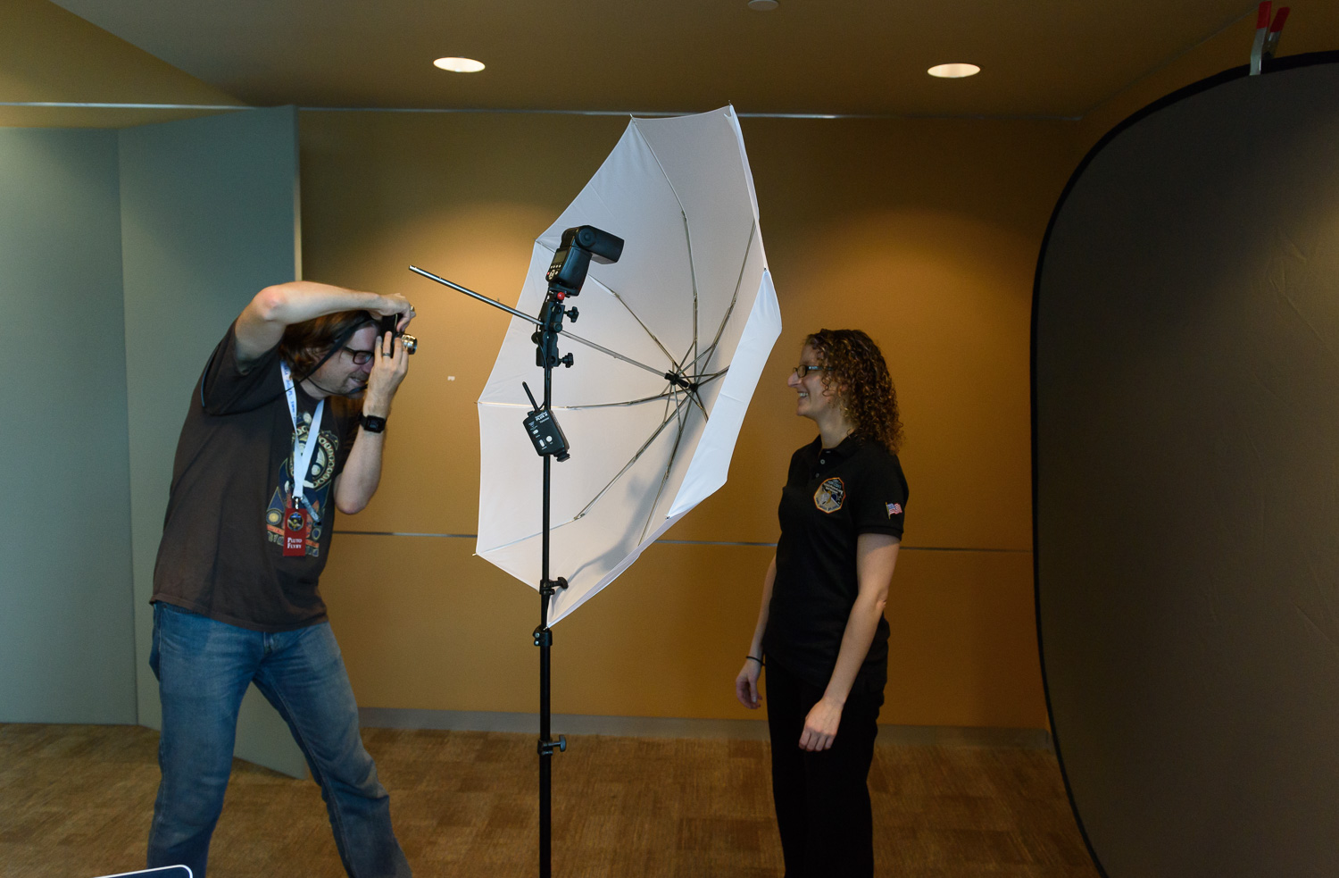 | Photographer Kyle Cassidy came by and shot some fantastic portraits of the New Horizons team for Slate. Here he's with Kelsi Singer. From Kyle's blog entry: "My Leica was a point of continual interest among the scientists and engineers. One asked if I built it. The optics team discussed, at great length, how modern lenses are built to disperse less light in the rear optics of because of the digital sensors." |