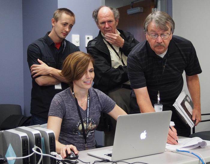 | Maarten Versteeg, Mark Tapley, Cathy Olkin, and Kim Ennico in the payload room. |