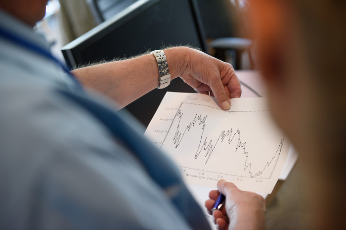 | Jason Cook, Cathy Olkin, and Dennis Reuter check out a new spectrum. |