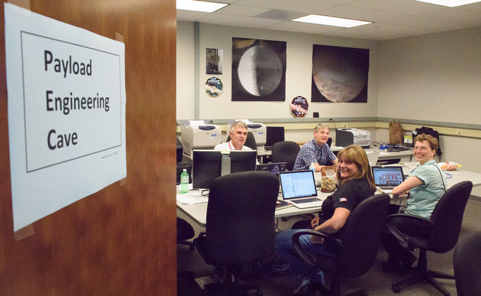| Kim Ennico, Cathy Olkin, Mark Tapley, and Maarten Versteeg in the Payload Engineering Cave. |