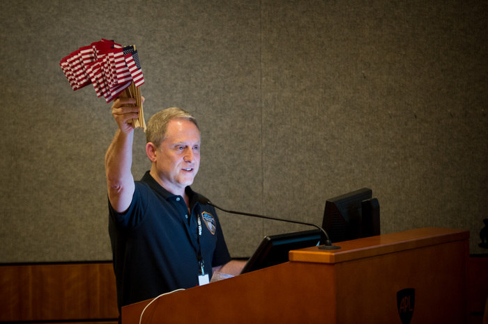 | Project Manager Glen Fountain talks at a post-flyby reception at the Kosiakoff Center. |