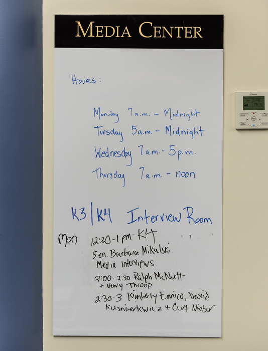 | Joel Parker goes over details before an interview outside APL's Kosiakoff Center. There are close to 200 media teams at APL for the encounter. [Check the #.] |