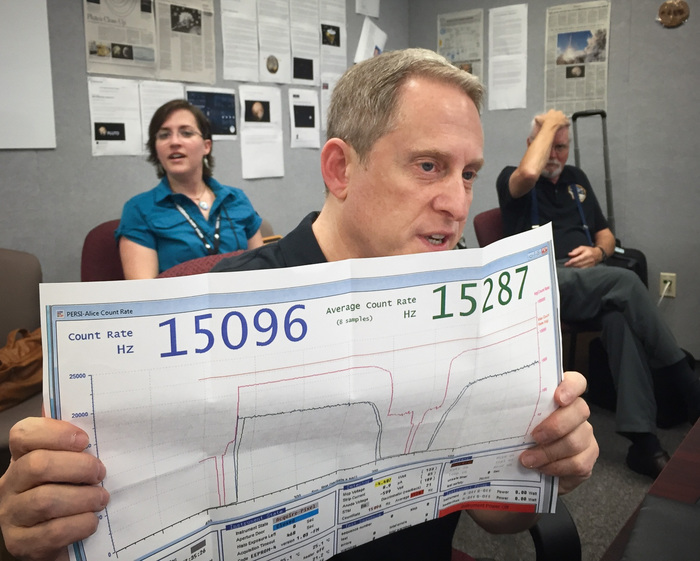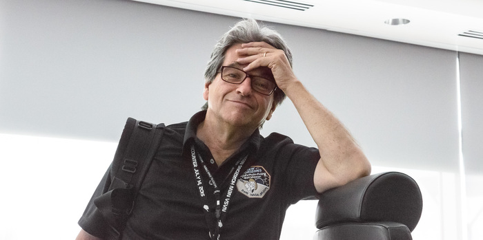 | Steve Maran shows off that NYT cover story! Steve is a science writer and retired astronomer, who was brought on as an embedded reporter within the NH team. |