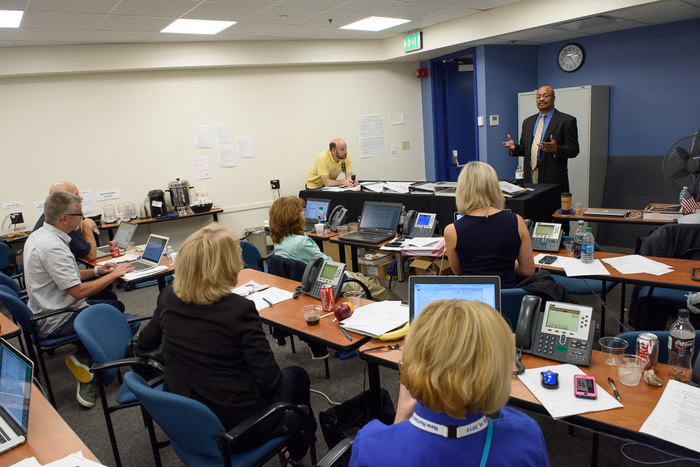 | Dwayne Brown briefs his team in the media center. |