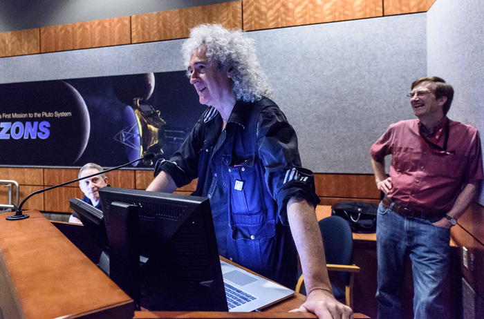 | Alan Stern, Brian May, Hal Weaver. Brian May took a couple of years off from academia to play in a band, but eventually returned and finished his PhD in astrophysics at Imperial College London in 2007. |