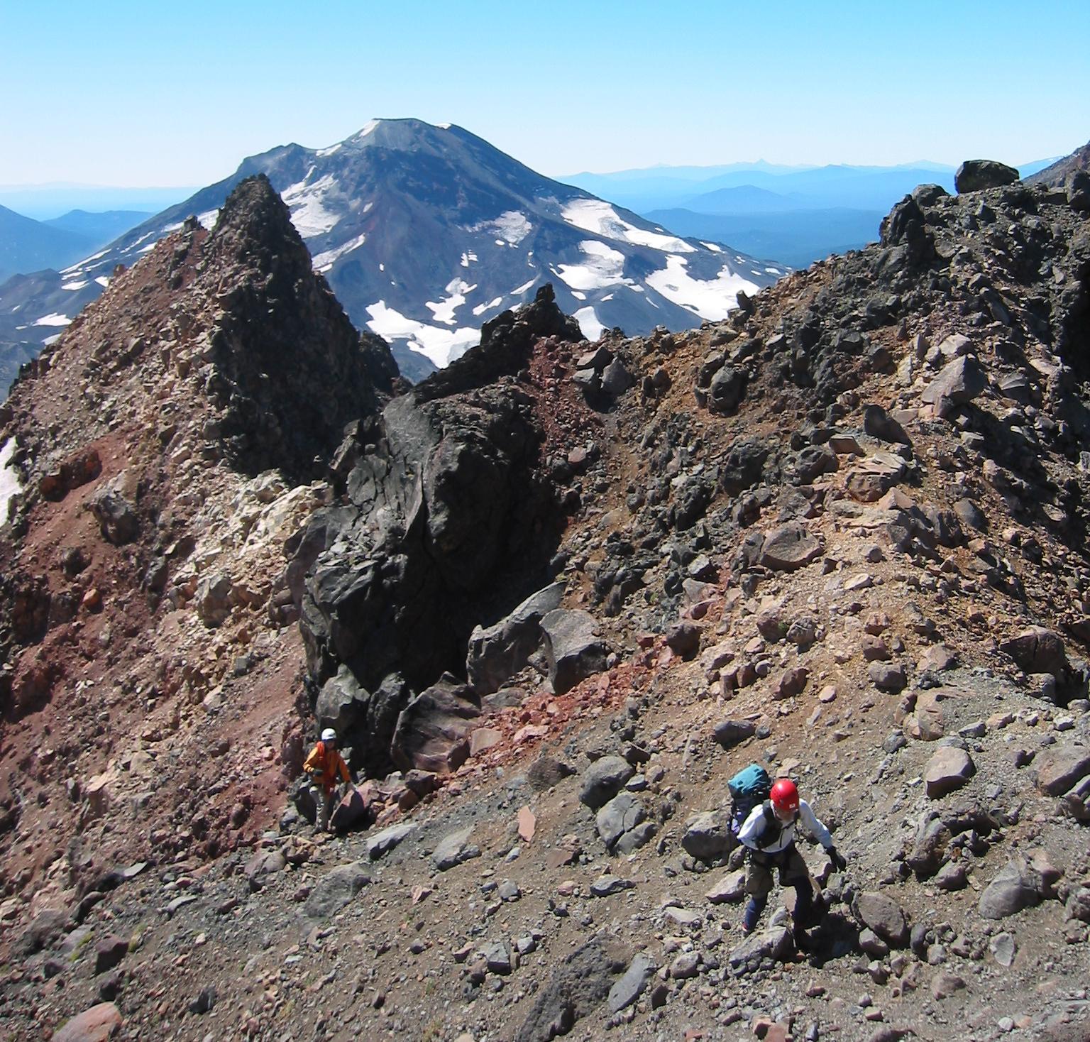 Passing behind the final gendarme before the summit pinnacle. (All the rest are passed on the W. side; this one is on the E.) South Sister and my own sister are both to the south.