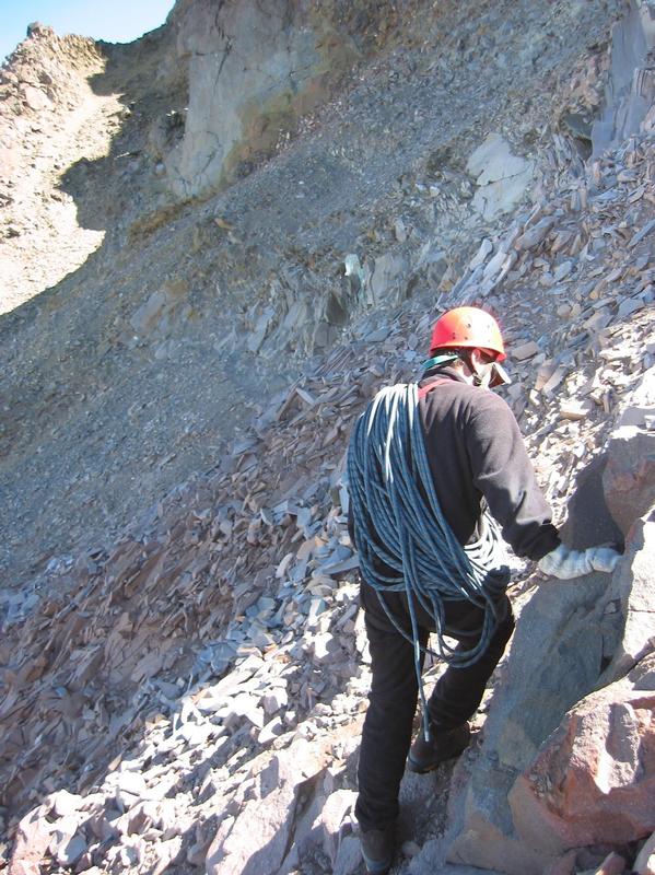 Phillip begins the section described in the books as the crux. The plates are loose and the walls are steep. It's pretty hairy. There's certainly nowhere to set up a rope. The `Bowling Alley' is to the far side, and the chute we meant to ascend (but missed at first) is just before that.