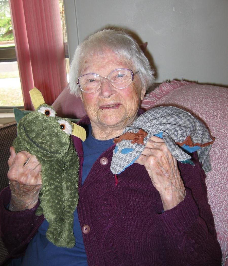 Granny enjoys both the frog and the ankylosaurus, although her wardrobe in the 1980's did not include a pair of slacks made of frog material.