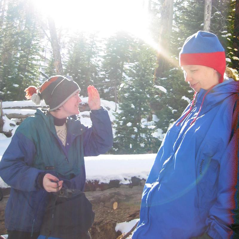 Sarah demonstrates a bit of a Jackie Chan move while Kathy is unimpressed.