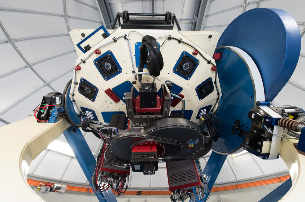 We're taking a tour of the LCOGT (Las Cumbres Global Observatory Telescope) 1-meter telescope. This is really cool. It's a brand-new network of telescopes, placed all across the globe. The idea is to focus not on spatial or spectral resolution, but on time. Having a network of telescopes lets a particular object be studied 24-7, with less concern for weather, set times, etc. Also, since their machine shop designs and manufactures every telescope identically, they can really optimize. Look at that perfect perfect cabling job -- so unlike the mess of wires coming out of most telescopes.