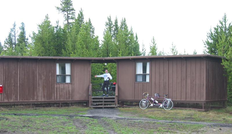 Ken enthuses about our flat roofed sleeping accomodations. (NB: flat roofs make very little sense in Yellowstone, given the 150+ inches/year of snow accumulation. Our later research found out that the park employs a full-time winter employee -- ala Jack Nicholson -- to remove snow from the cabins. This past winter, this particular employee failed to detain the pine martens entering the lodge/restaurant, where they soon took up residence causing $75,000 of damage to the carpets and linens. One cabin was also crushed, but this is par for the course.)