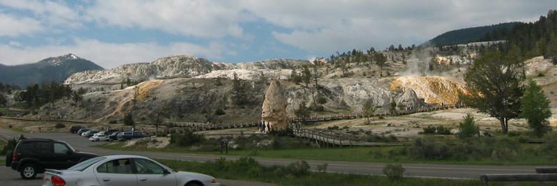 The basic scene at the Mammoth hot springs. I searched and found no mammoths on the premises.