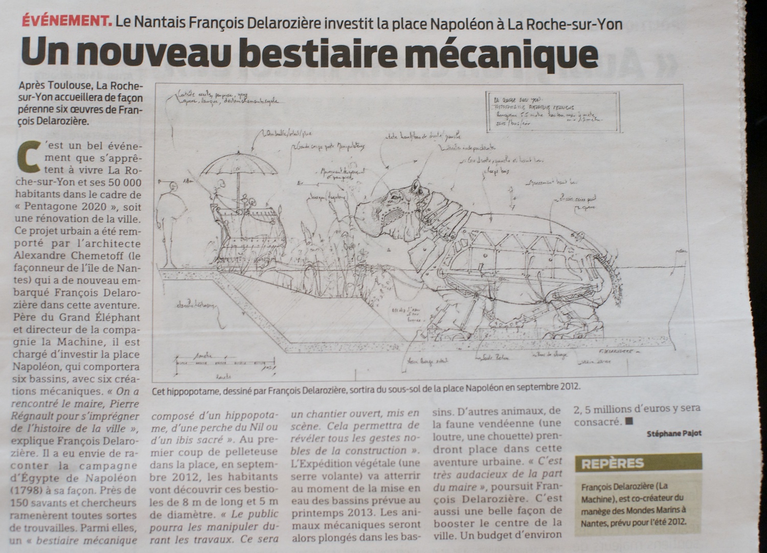 | Whoa! OK, here I am out eating one of the famous Nantes buckwheat crepes, and I open up a local paper only to find this on page two! Fabulous news -- a new mechanical hippo is to be built! |