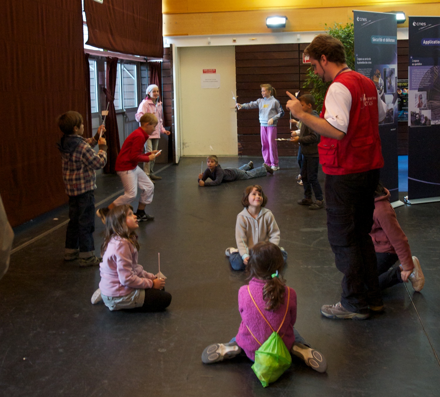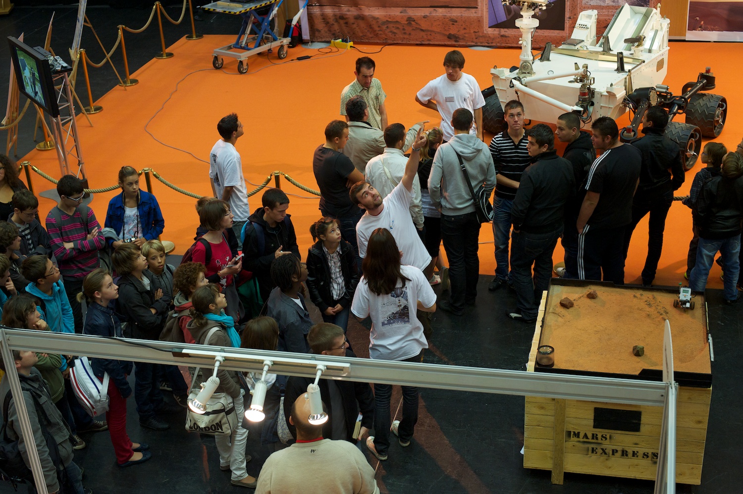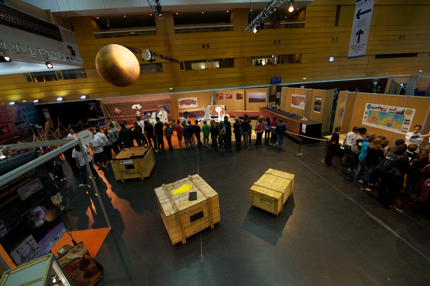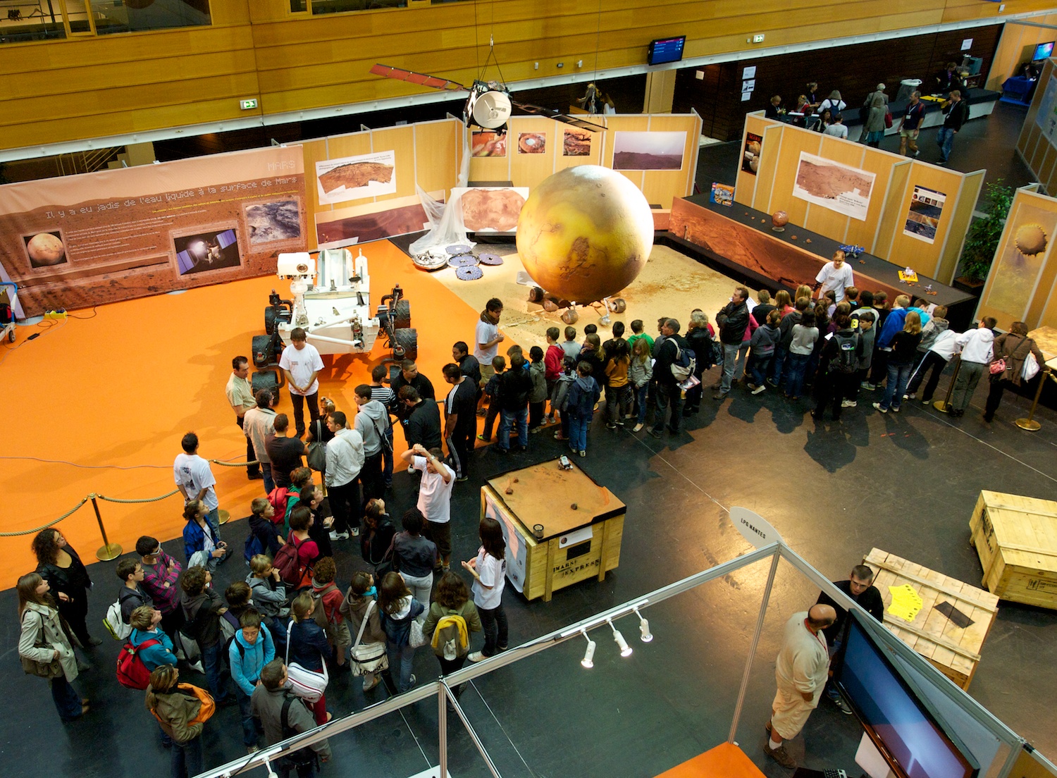 | Downstairs, bunches of French students visit a very large solar system exhibit set up. |