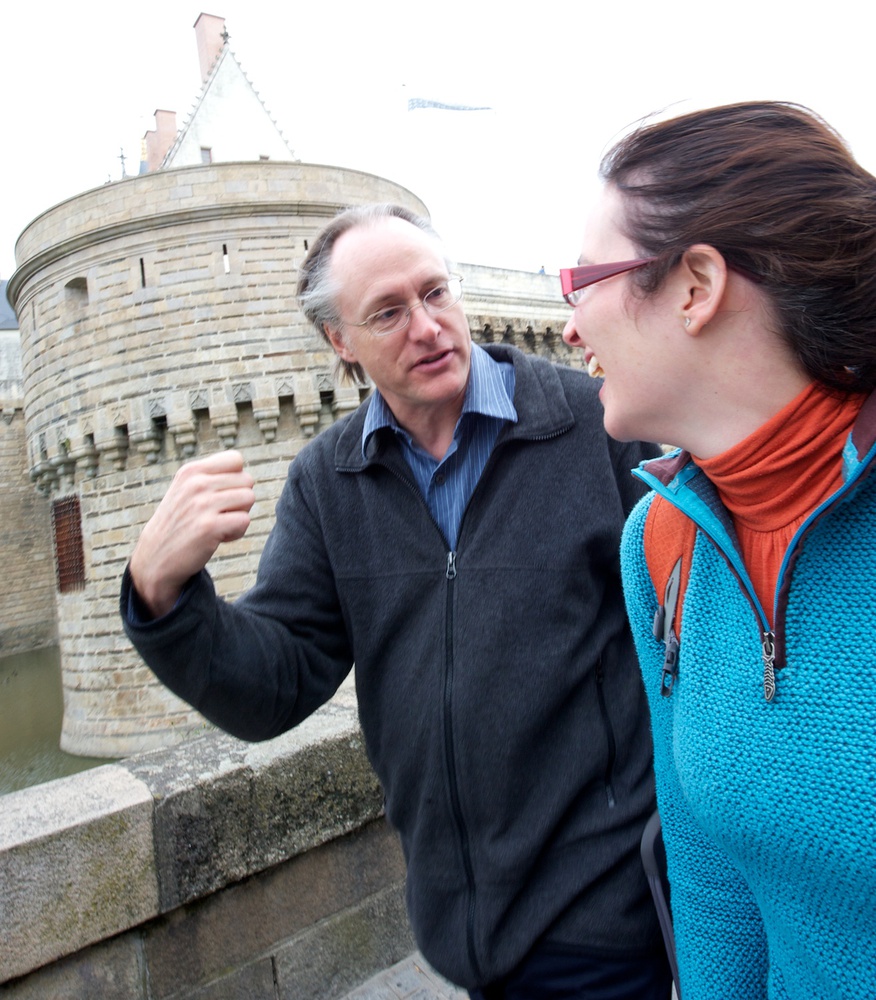 Marc Buie and Carly Howett walk past the Nantes castle. They appear unconcerned about the moat below!