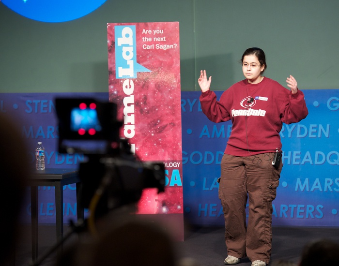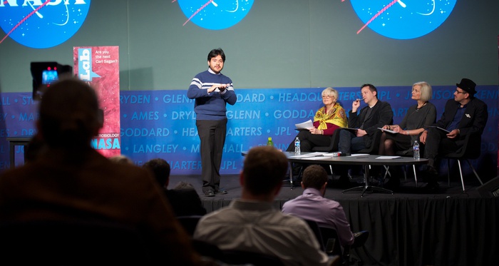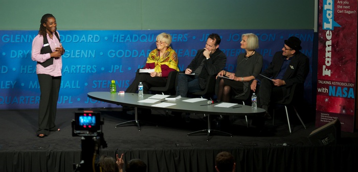The judging panel at NASA HQ: Nikki Lowry, Bill Margol, Linda Billings, and David Grinspoon. |