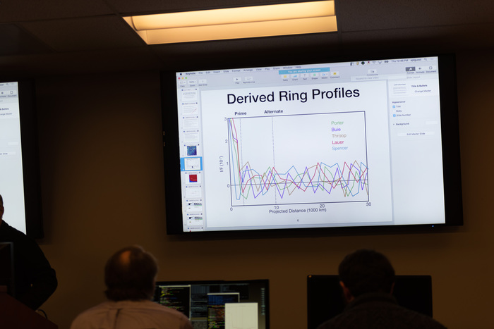 | Hal Weaver checks out some of Marc Buie's flattened image stacks (center bottom) and radial profiles (two white plots). |