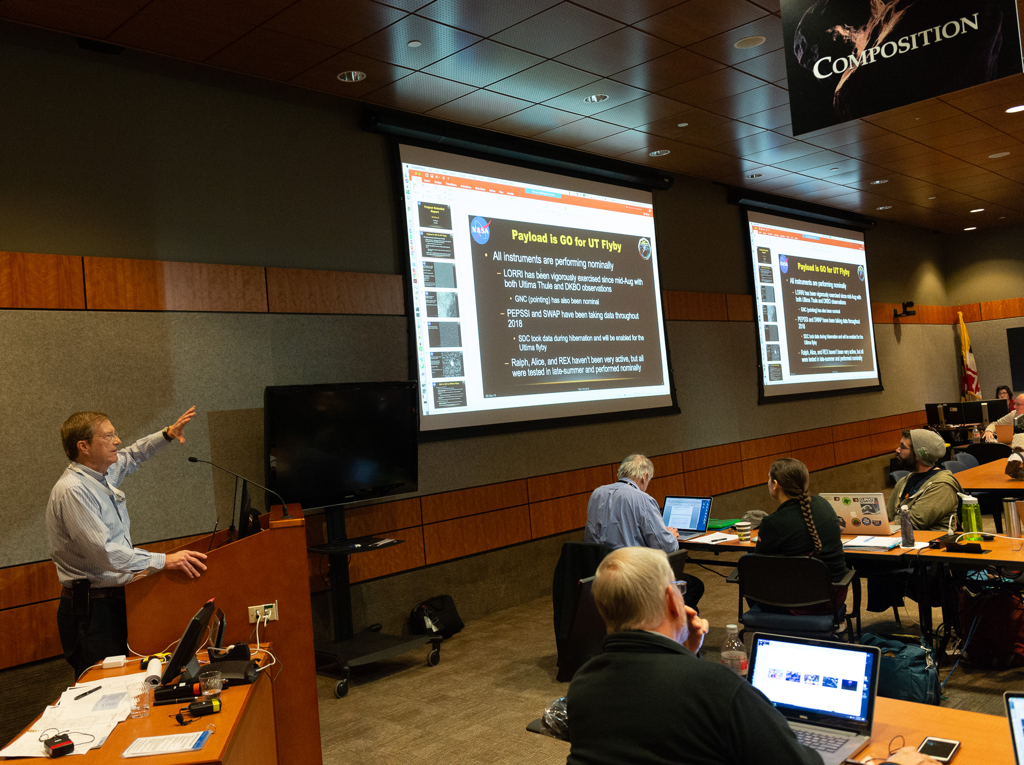 It's December 27, and the science team has assembled for the Arrokoth flyby! Although it's been three years since the Pluto flyby, most of the same team has been working on the planning for this one, which we started on just after Pluto. I was on the Hazard Team searching for dust at Arrokoth (*) that could be in the way of the spacecraft, and we'd been here since Thanksgiving, except for a week off around Christmas. The rest of the team assembled in-person at "K-3d" -- i.e., three days before the flyby in the Kuiper belt.