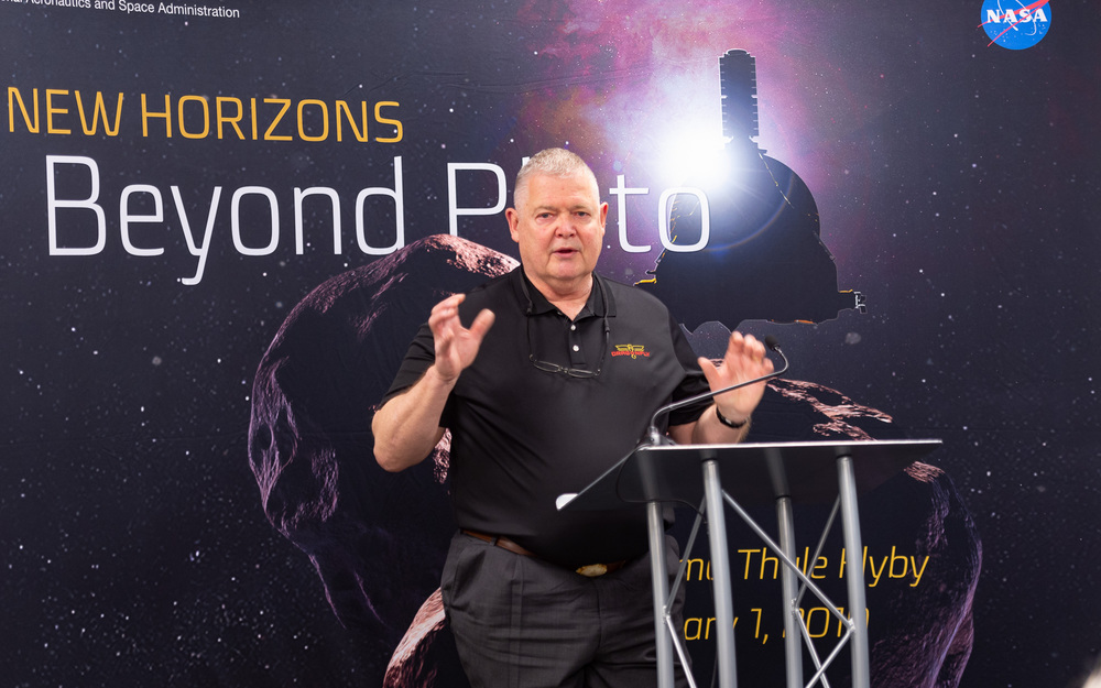 Ooo -- check out that shirt he's wearing. It's not for New Horizons, but actually for Dragonfly. Dragonfly is a nuclear-powered drone that APL was proposing to fly to Saturn's moon Titan. Six months after the Arrokoth flyby, NASA announced that APL was selected to build Dragonfly and head to Titan. So cool. With that, APL will have built two of NASA's four 'New Frontiers' missions: New Horizons, and Dragonfly.