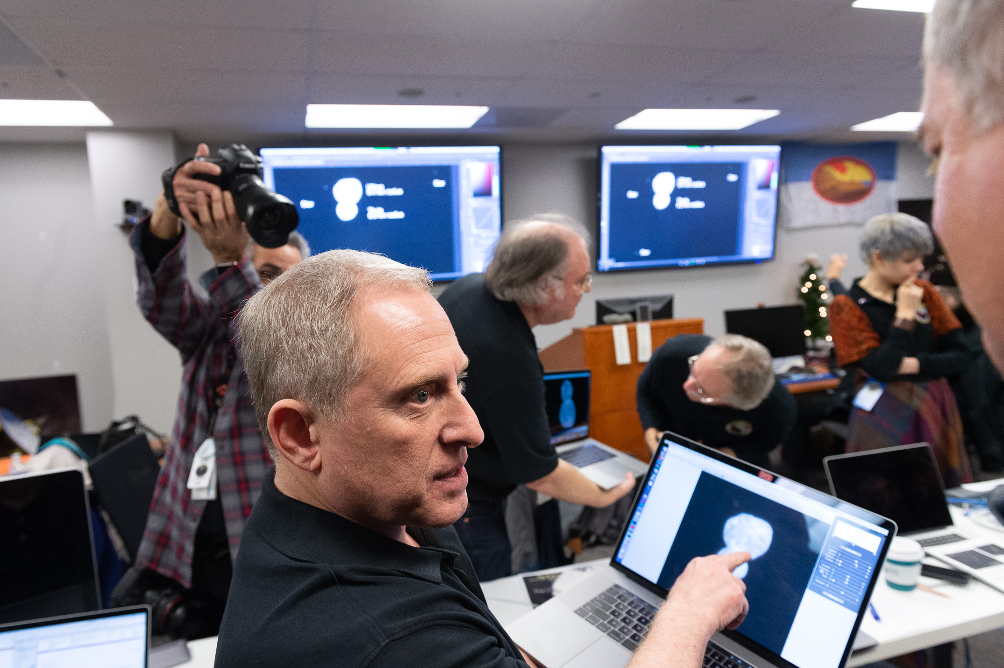 Alan Stern looks at Arrokoth, while John Spencer tilts his head to see Tod Lauer's inverted version.