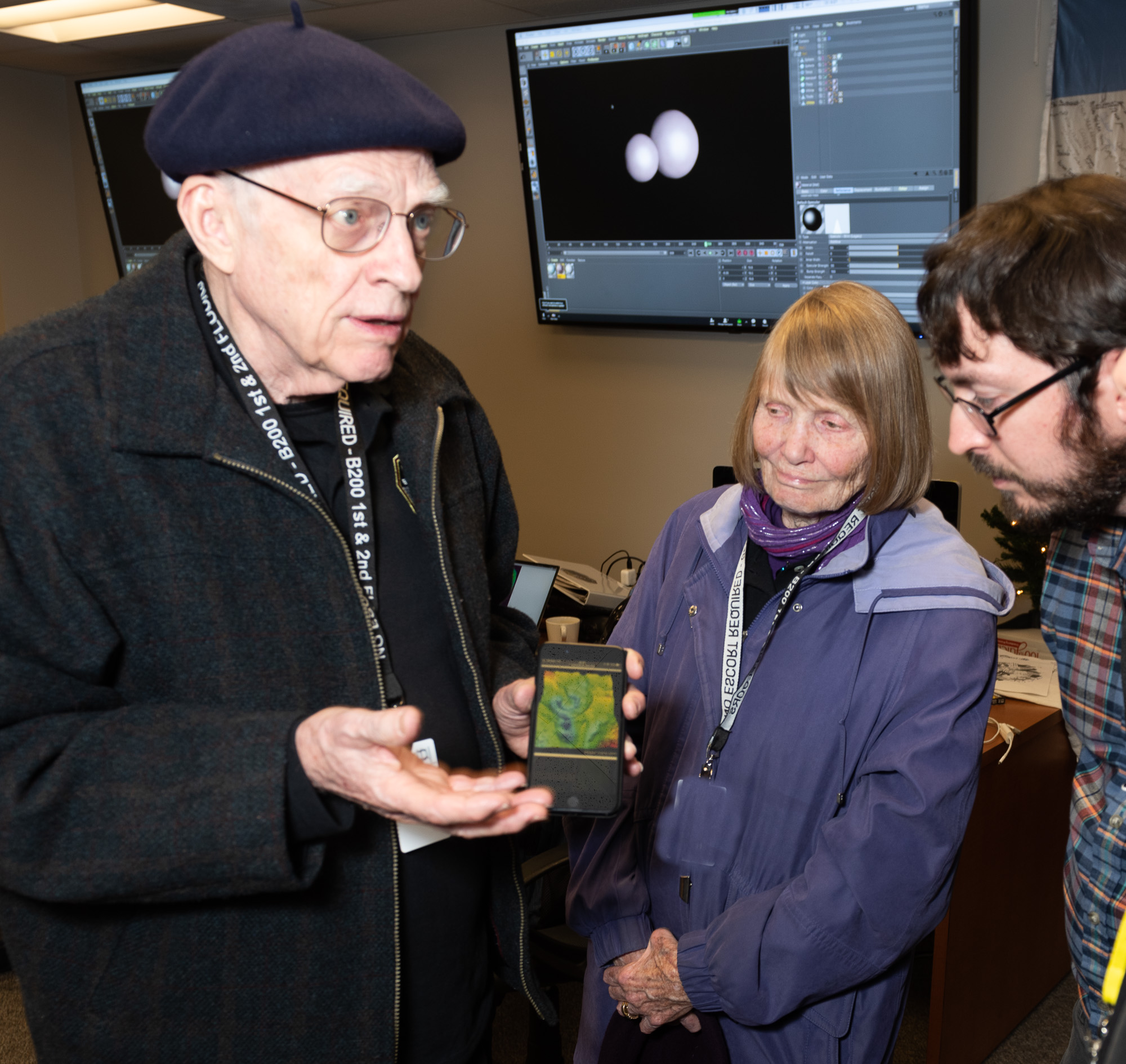 Simon Porter checks out the gravimetric map of the Yucatan, with Walter Alvarez.