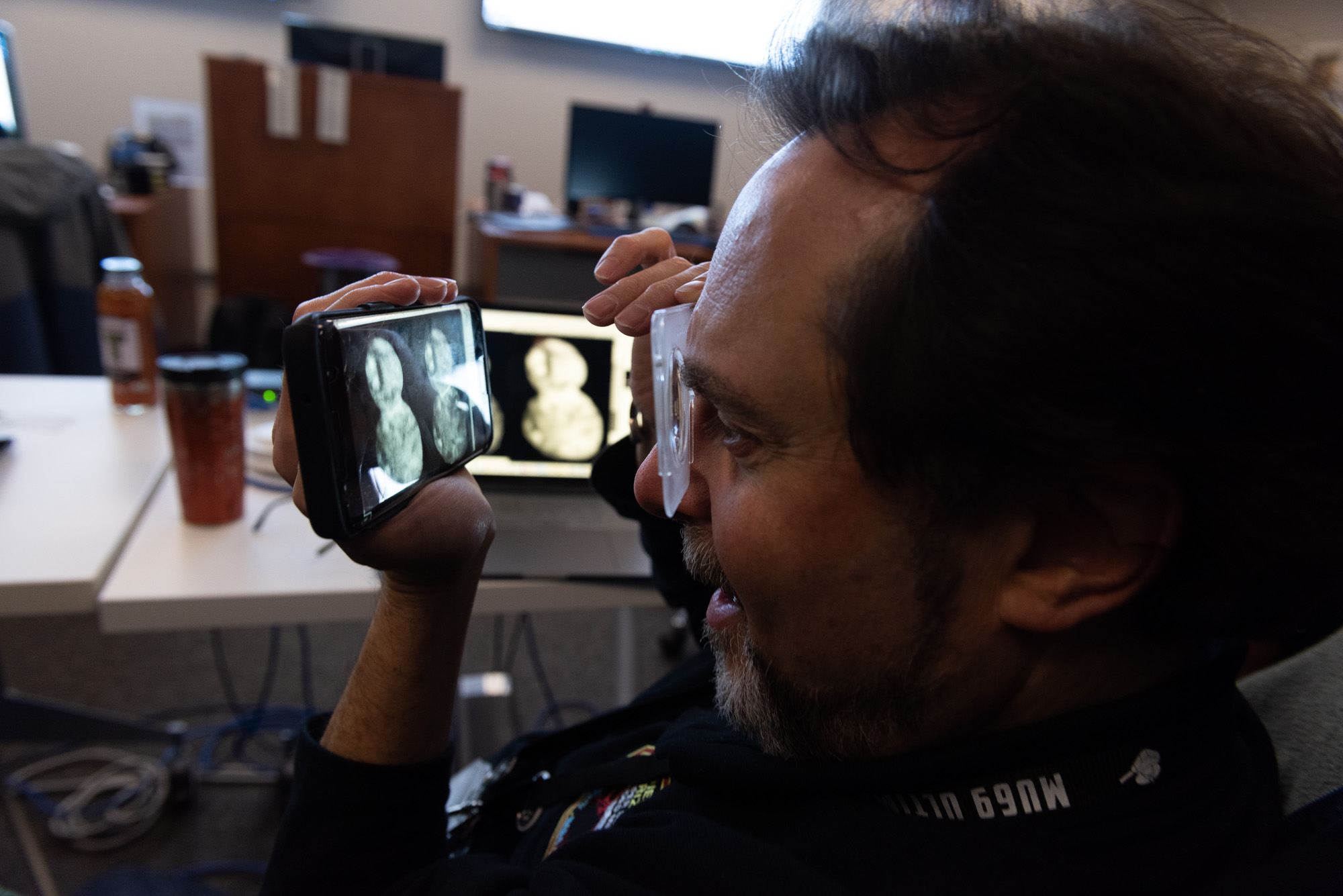 Check it out: it's Arrokoth in 3D! Because the two frames were taken from a slightly different perspective, they can be assembled into a stereo image. Andy thinks he has the orientation figured out properly to show something in 3D. He puts together an image pair, and uses a pair of Brian May's stereo glasses to view it. These glasses were borrowed from a copy of Brian May's 3D Moon book, which John Spencer had brought in.