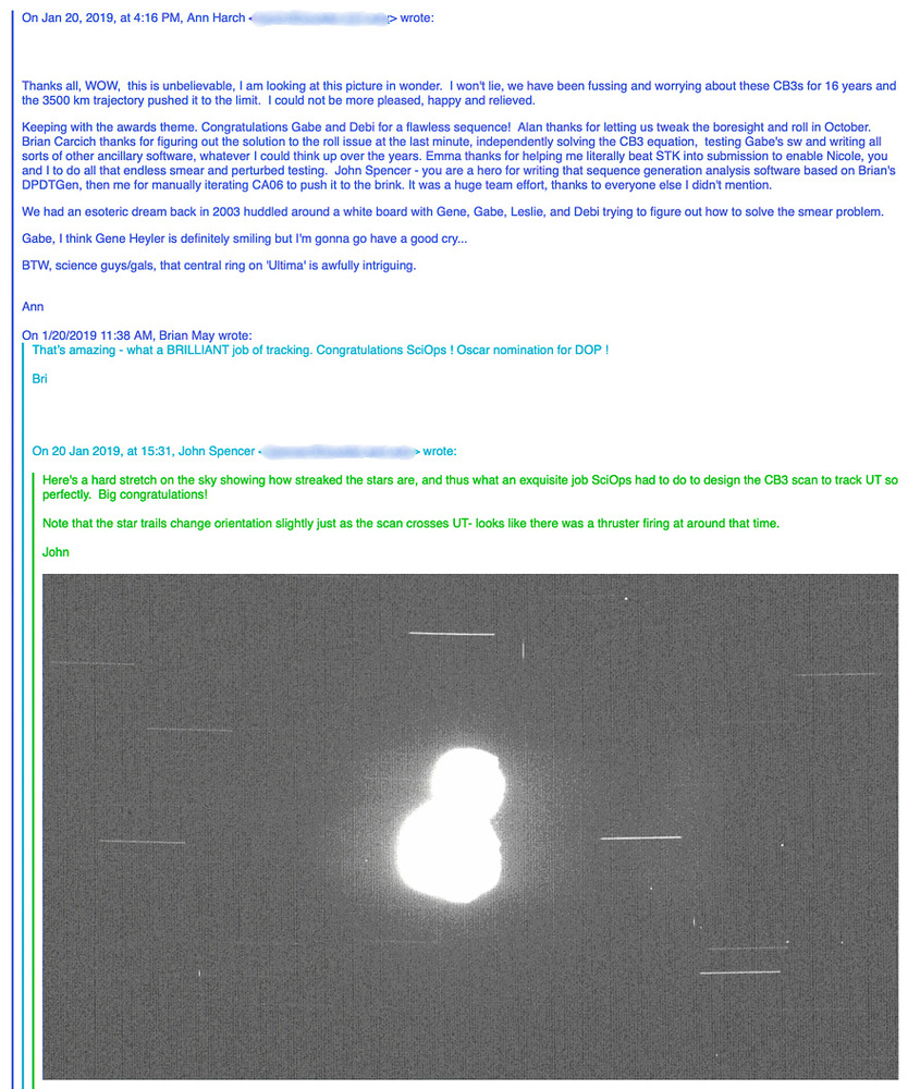 The levels are set here so that Arrokoth is white, but that's just so you can see the blurred stellar motion in the background, which is what is totally unique about this frame. Emails used with permission.