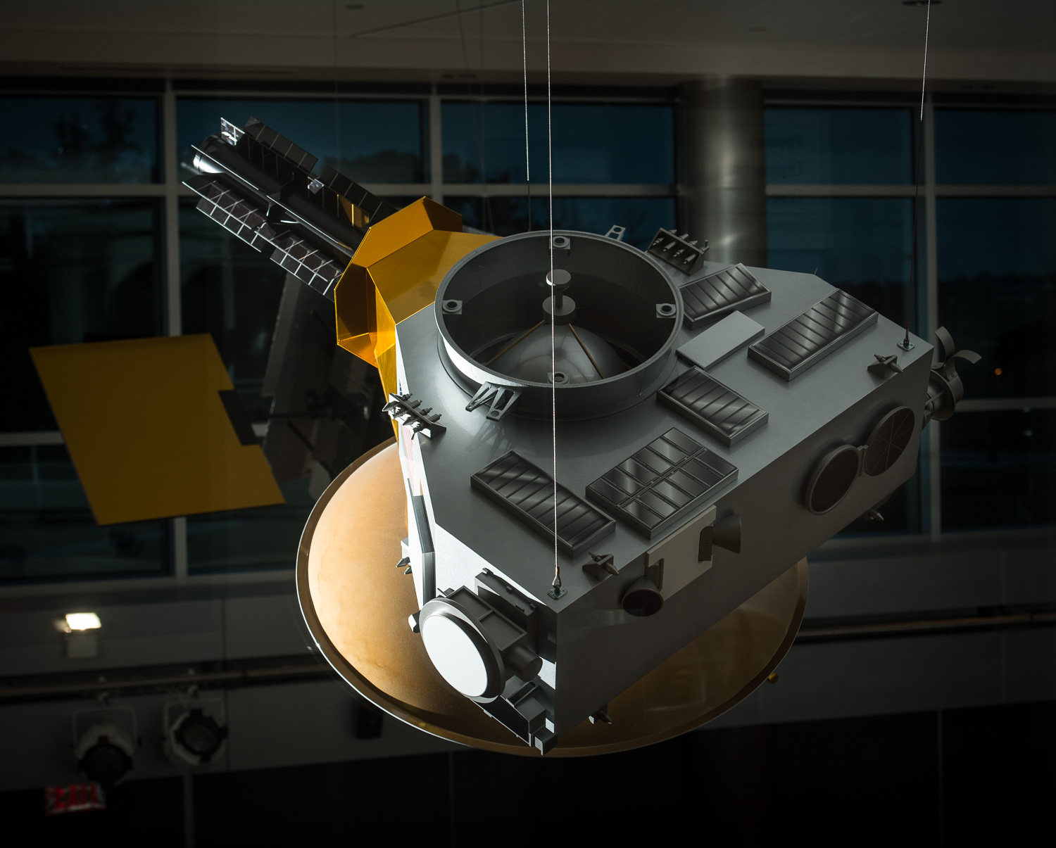| New Horizons flies in the lobby of APL's building 200. (I took this at night illuminated with remote flashes, which did give the security guards some concern.) |
