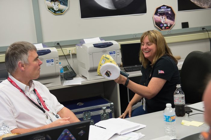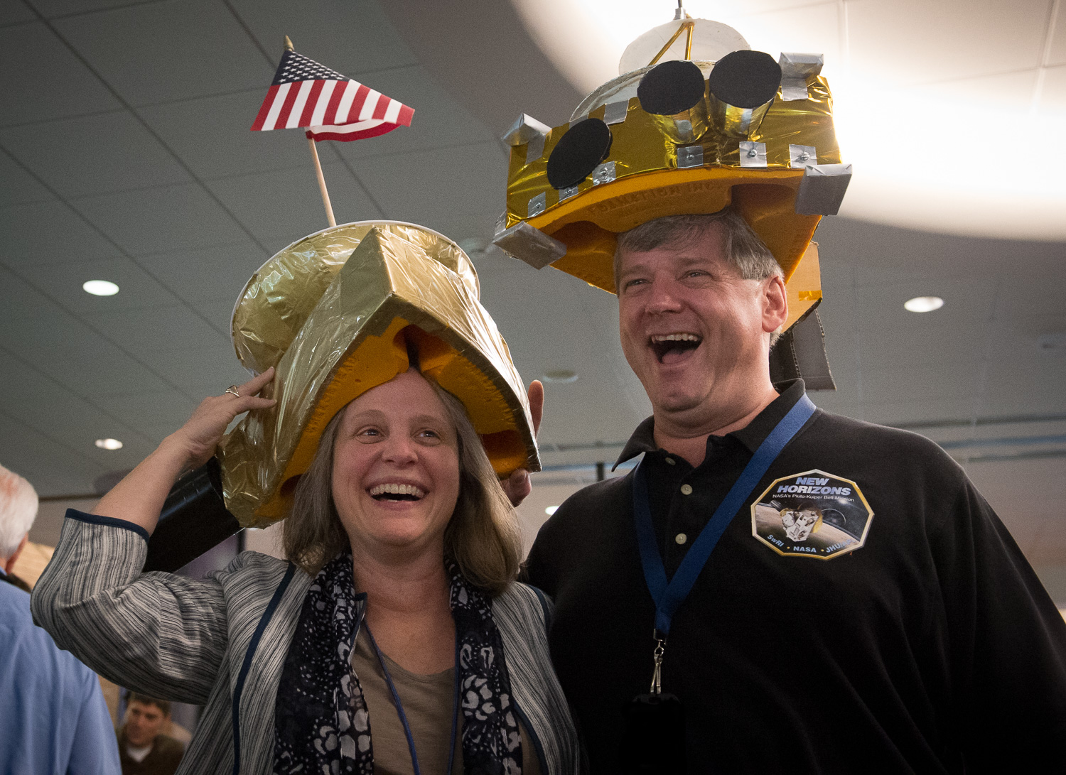 | Alice Bowman and Karl Whittenburg, sporting some really nice cheeshead-styled New Horizons hats. |