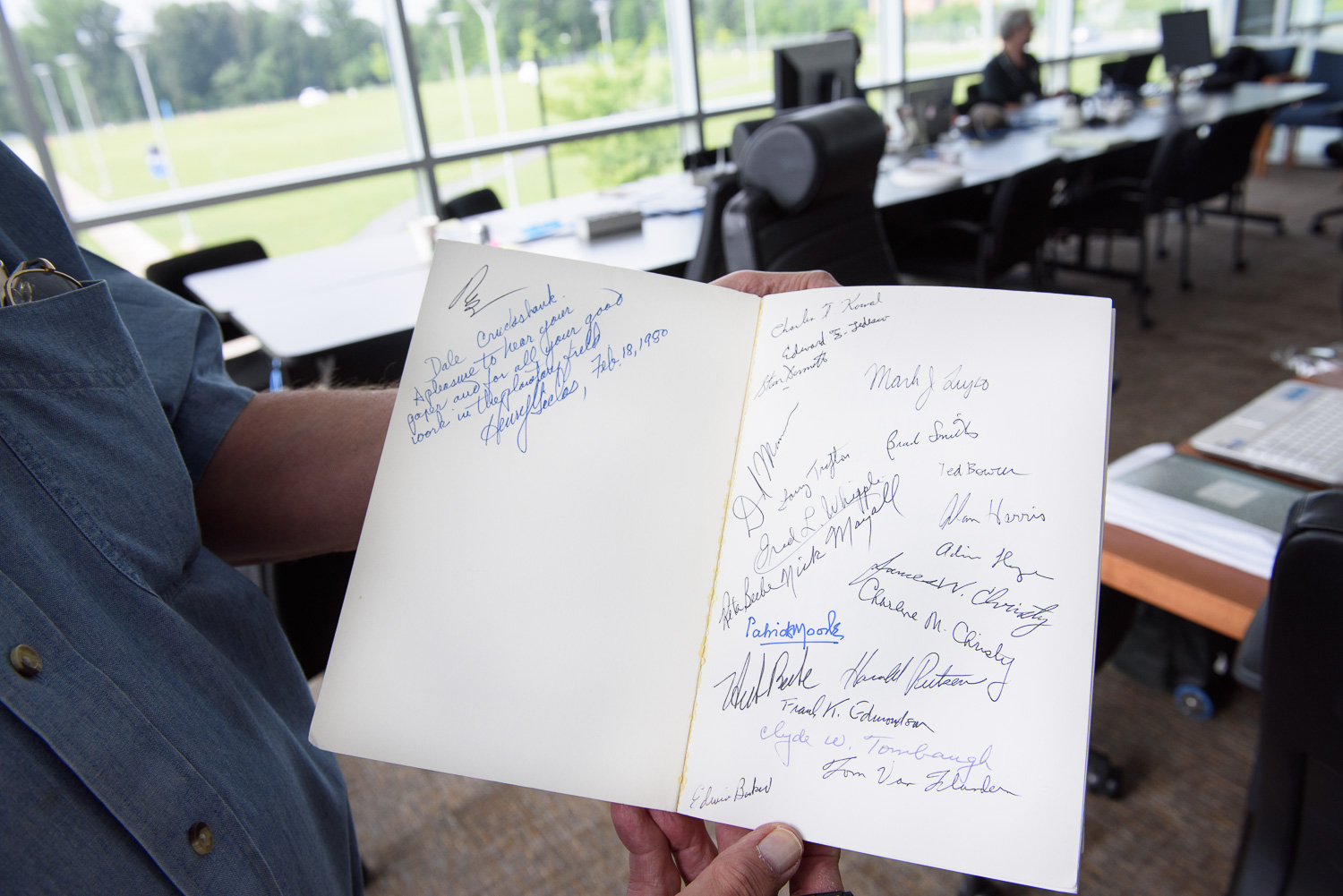 | Alan Lunsford, Joe Peterson, and Eddie Weigle share denials of responsibility. In front of them is one of the 'playbooks', the human-readable spacecraft observing schedule. |